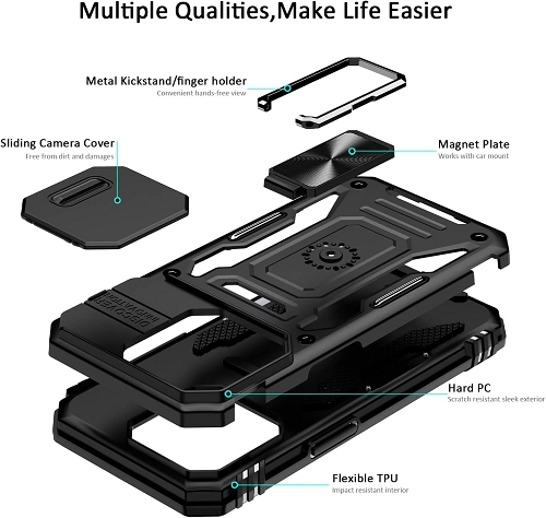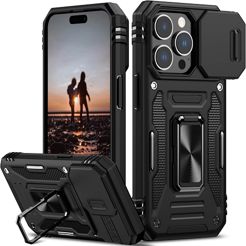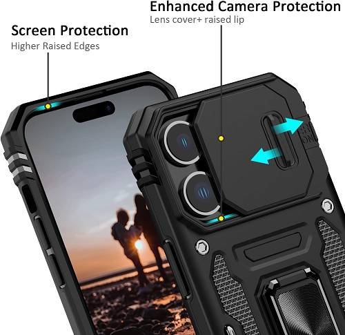 IPH 15 PRO PROTECTIVE RING ARMOR W/CAMERA LENS COVER, BLACK
